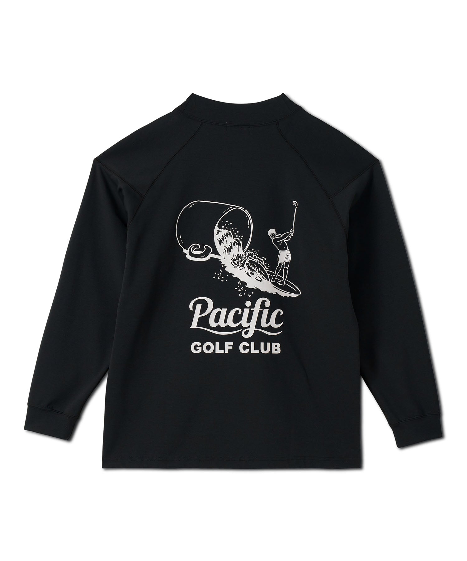 左胸にPGCのフラッグロゴマークを刺繍、背中のプリントはPacific DRIVE-INでもお馴染みのイラストレーターFACE氏の描き下ろしのサーフィンしつつゴルフするユニークなキャラクターをプリント。着用感と機能性、存在感を兼ね備えた一枚です。