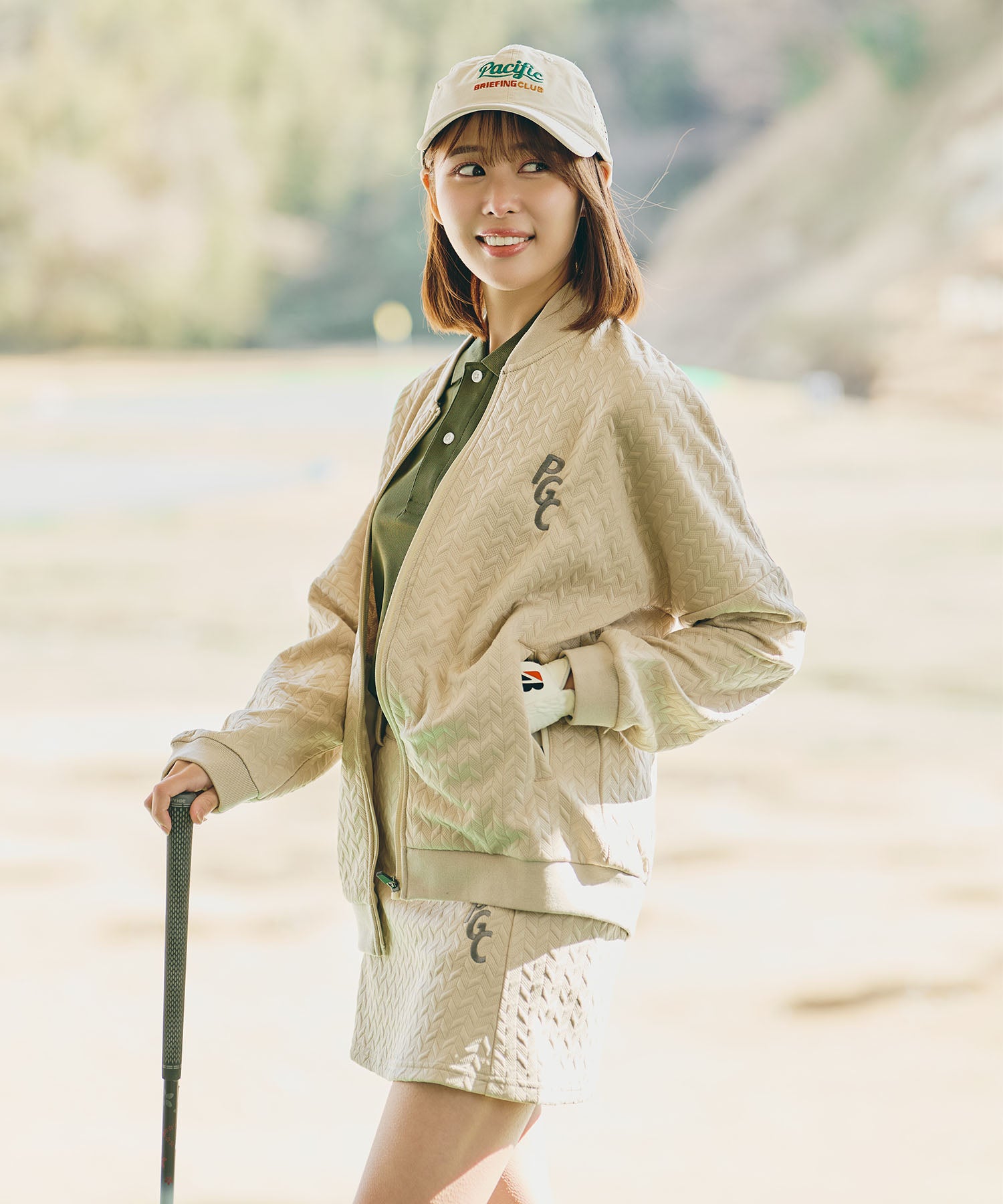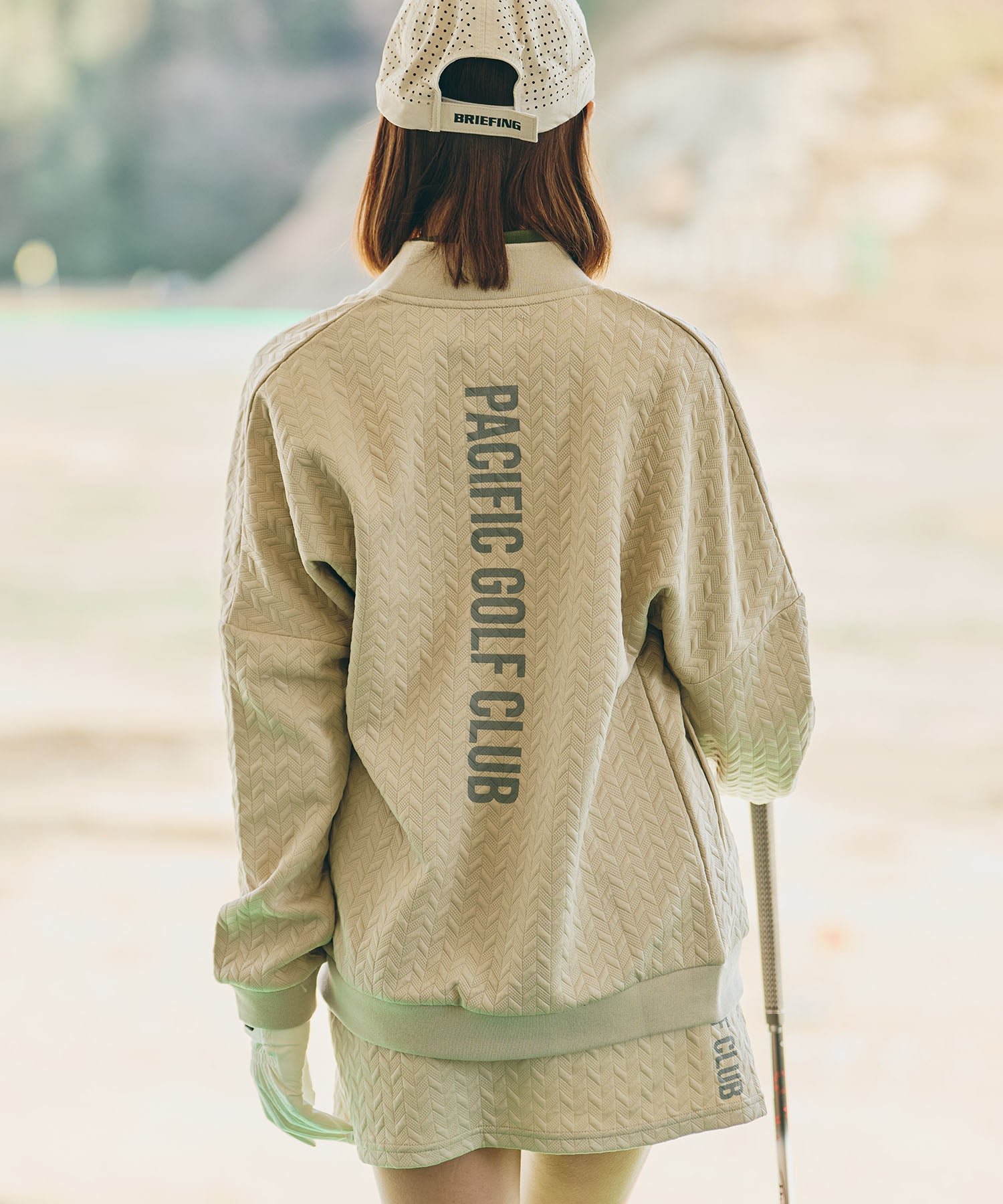 フロントにはロゴ刺繍を施し、バックには縦に配置した「PACIFIC GOLF CLUB」のプリントが印象的。